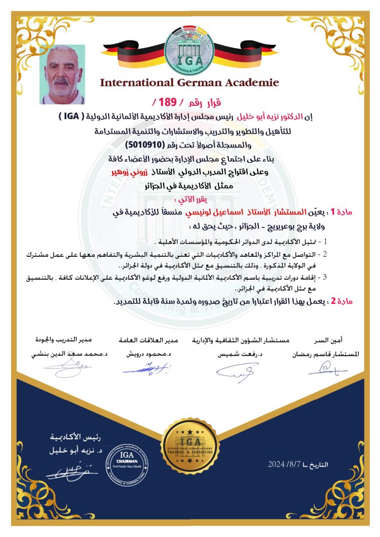 قرار بتعيين السيد اسماعيل لونيسي منسقا للأكاديمية في الجزائر – ولاية برج بوعريريج