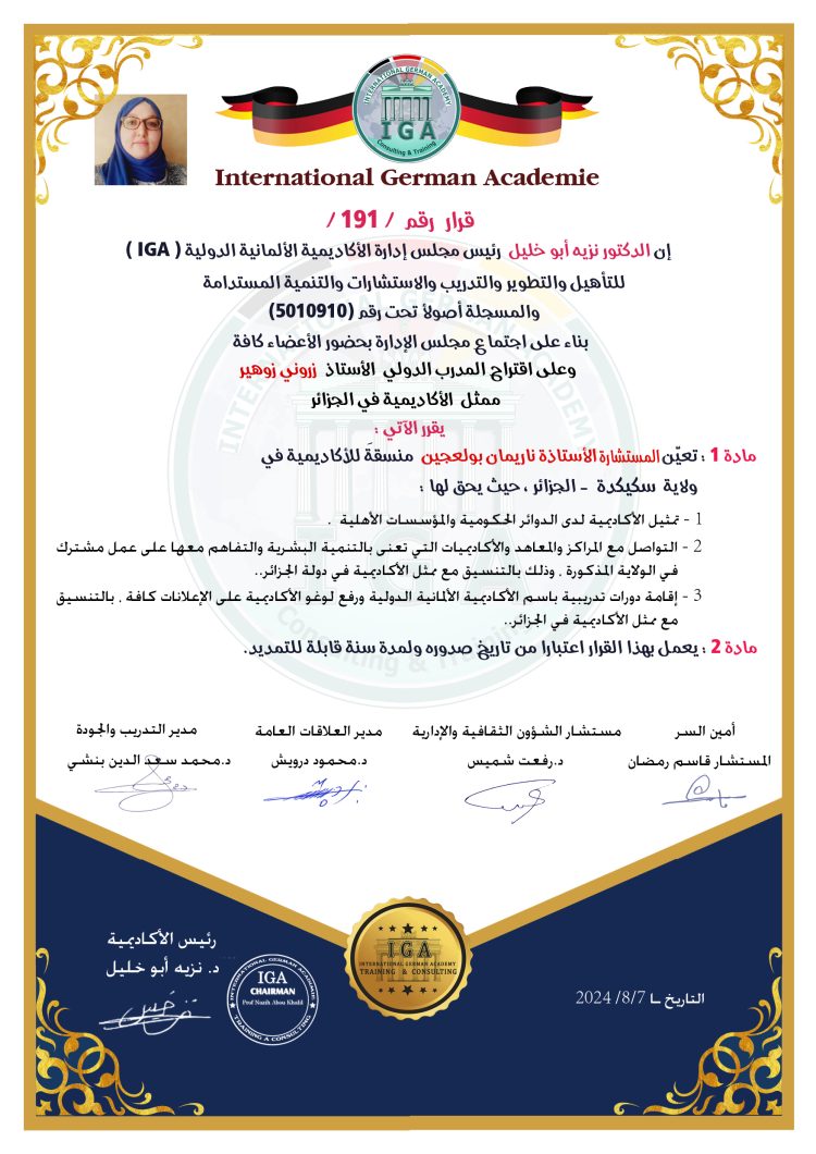 قرار بتعيين المستشارة الأستاذة ناريمان بولعجين منسقة للأكاديمية في الجزائر – ولاية سكيكدة