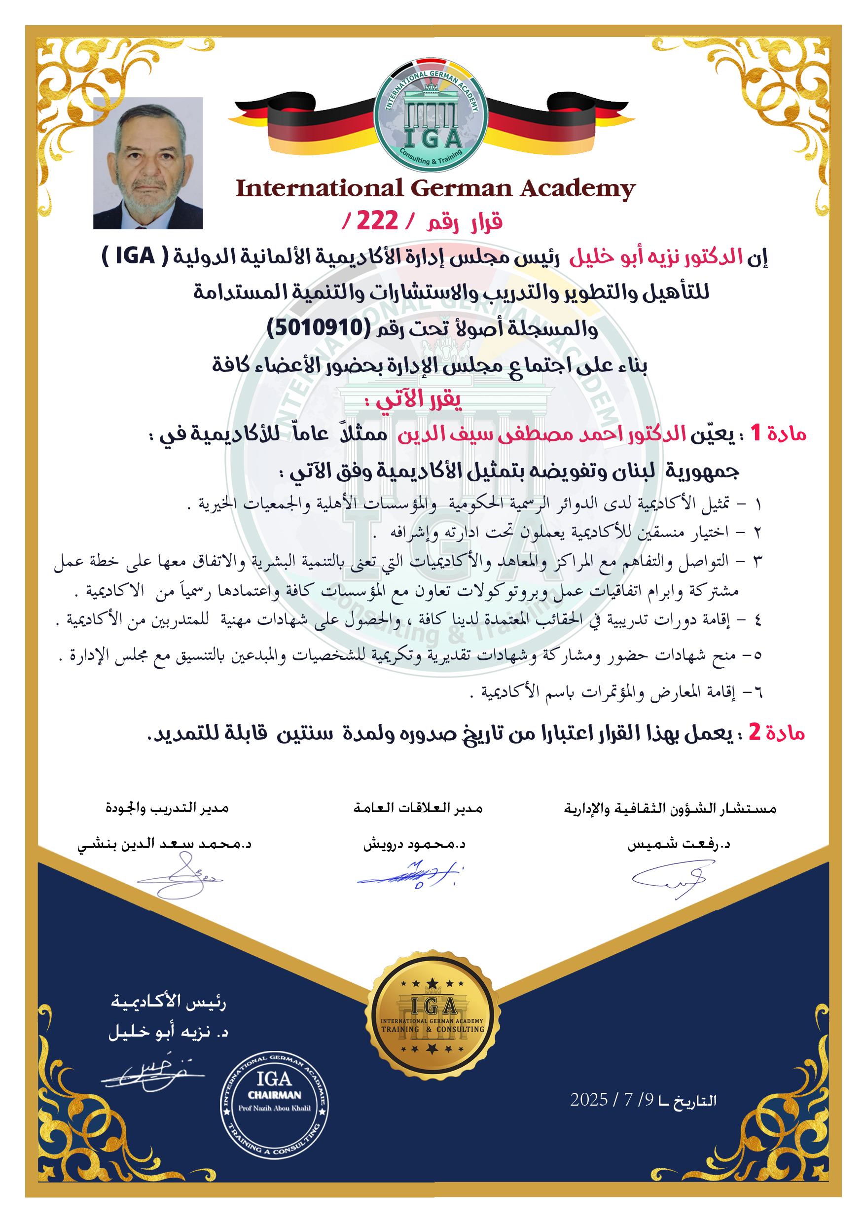 توثيق وتصديق أوراق اعتماد الدكتور محمد وليد مهدي ممثلاً للأكاديمية الألمانية الدولية  في جمهورية العراق